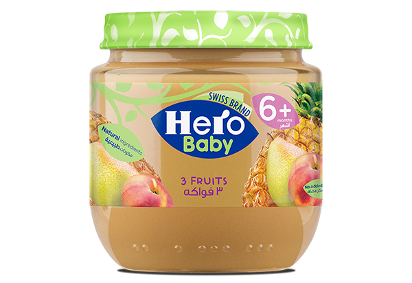 HERO BABY 3 FRUITS 130G JAR – هيرو بيبي ٣ فواكه ١٣٠ غرام مرطبان